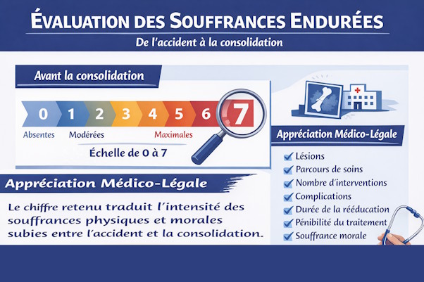 L’évaluation des souffrances endurées repose sur une échelle chiffrée, généralement de 0 à 7. Derrière ce chiffre, il y a une appréciation médico-légale : l’Expert se prononce en tenant compte des lésions, du parcours de soins, du nombre d’interventions, des complications, de la durée de la rééducation, de la pénibilité du traitement, de la souffrance morale liée aux circonstances, et plus largement de l’intensité et de la durée de ce qui a été enduré.