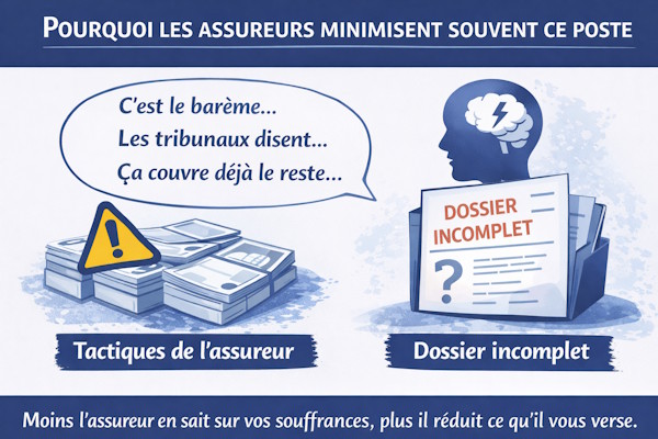 Cet exemple met en lumière une règle simple : les souffrances endurées ne sont pas une prime automatique. Ce poste se gagne quand le dossier raconte la vérité, entièrement, et quand l’expertise ne se contente pas d’un survol. Ce que cherchent certains assureurs, c’est une lecture froide : une blessure, un acte, un délai, puis une somme. Ils ne voient pas l’humain, ou ils font semblant de ne pas le voir. Et lorsque la victime n’est pas accompagnée, elle a tendance à simplifier, à minimiser, à dire “ça va mieux” au moment même où l’on doit décrire ce qui a été vécu. On se retrouve alors avec un chiffre bas et un discours d’assurance qui affirme que c’est “cohérent”.